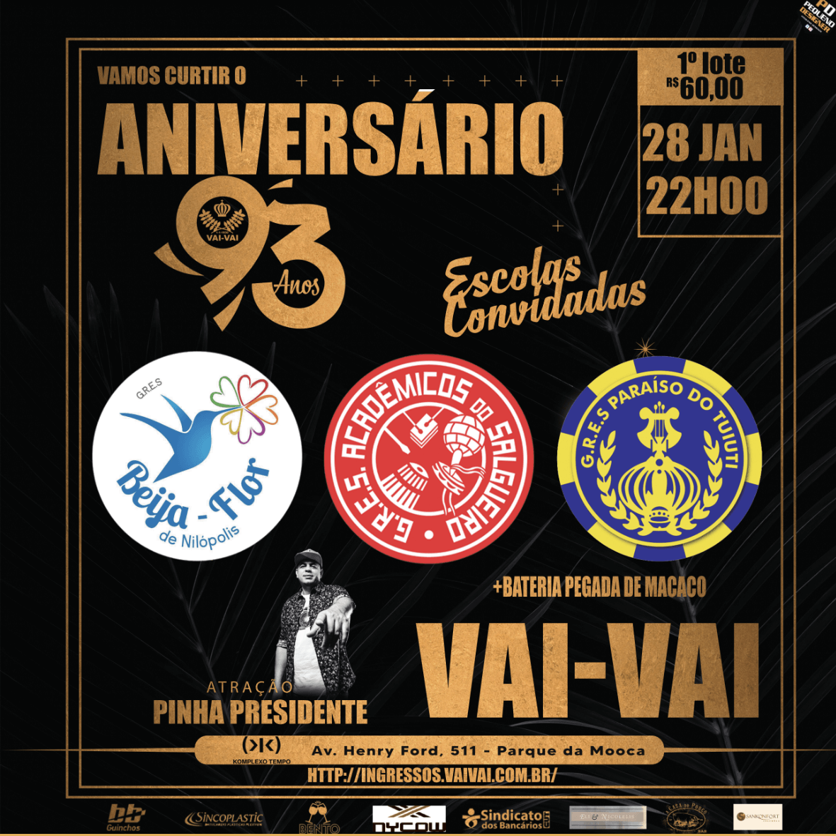 Em 2023 completamos 93 anos e a festa será no dia 28 de janeiro, a partir das 22h, no Complexo Tempo, com shows das nossas coirmãs cariocas: Beija Flor, Salgueiro e Paraíso do Tuiuti, além do Pinha Presidente, que também se apresenta. Pra abrilhantar ainda mais, nossa ala musical e a Bateria Pegada de Macaco dão o tom!